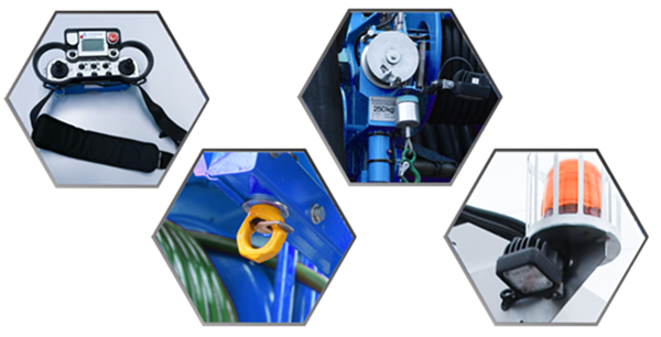 - Reel rotation direction electrohydraulically controlled by control panel/radio remote control