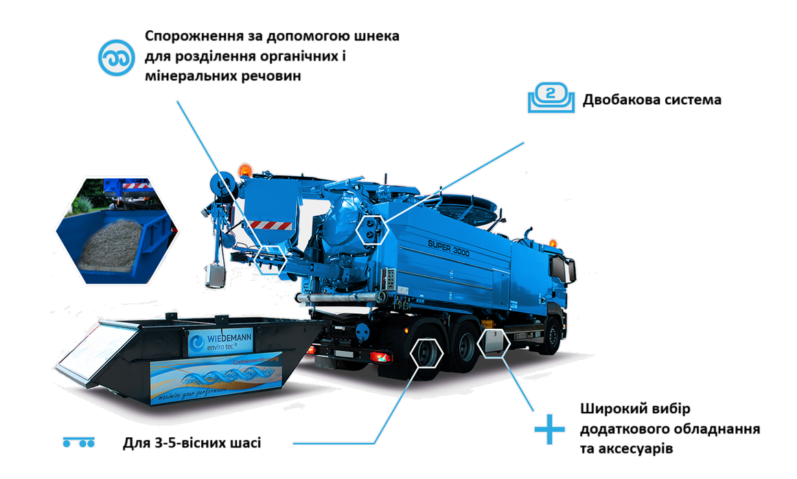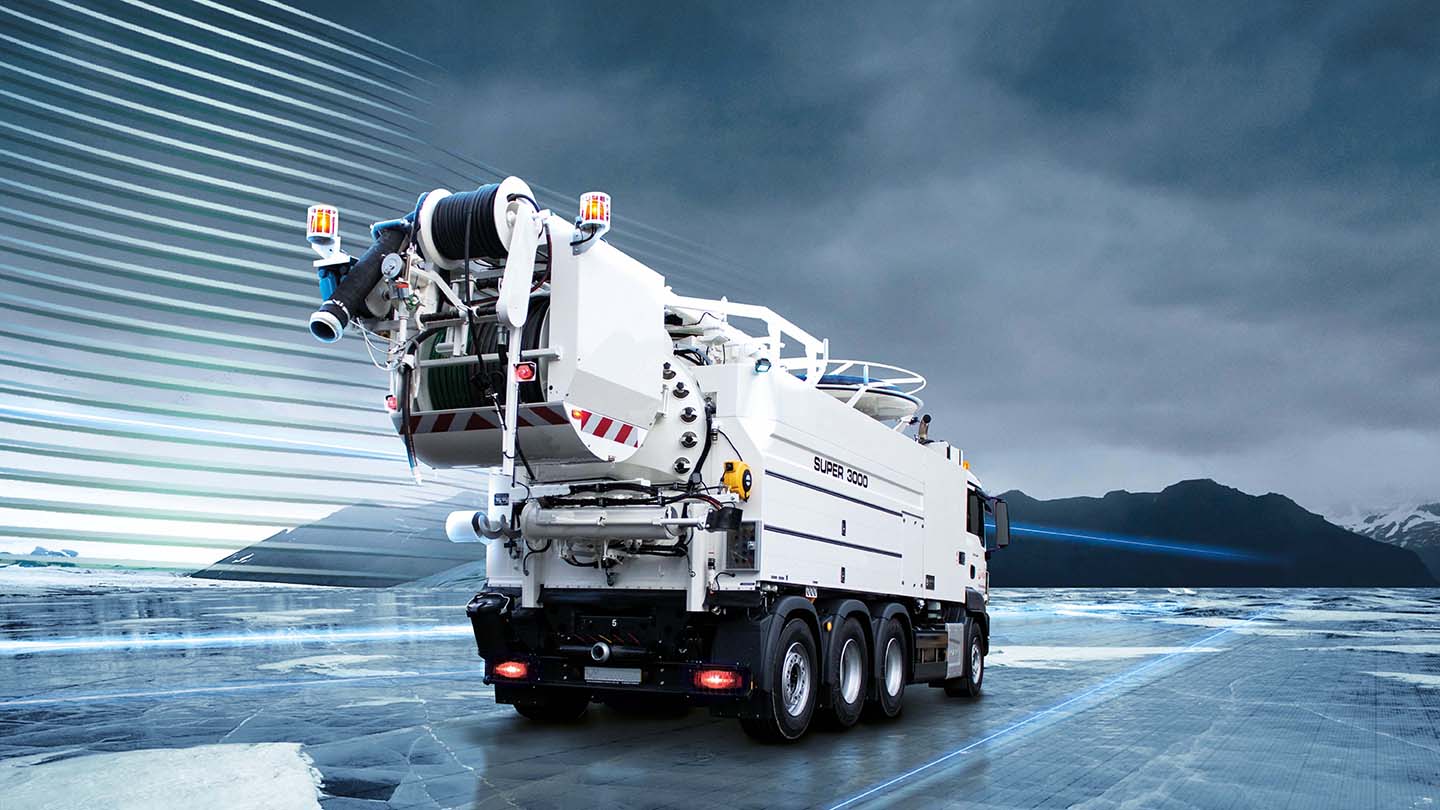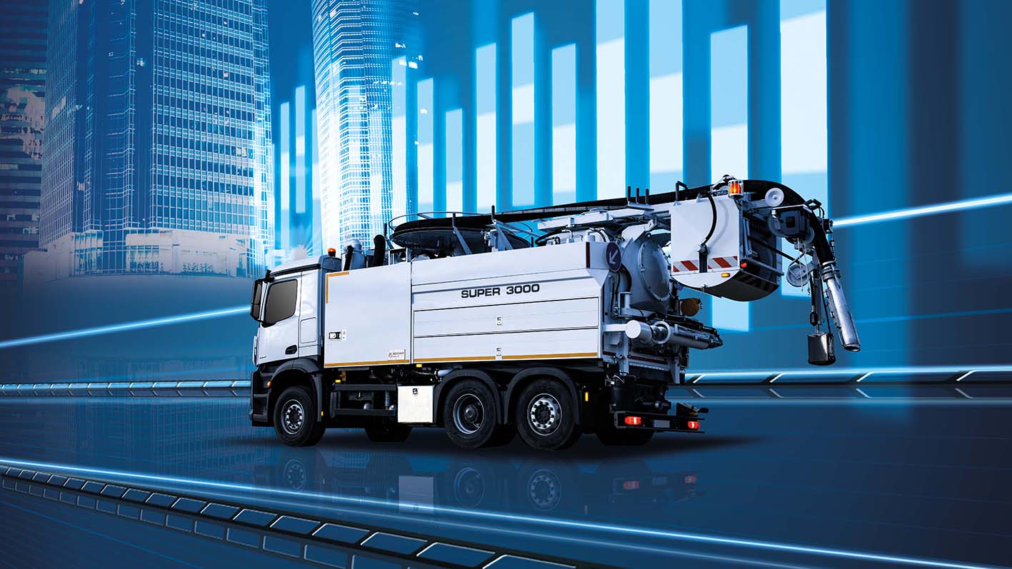 Super 3000 – автомобіль для очищення каналізації з двосекційною системою баків. Ідеально підходить для великих міст із інтенсивним рухом.